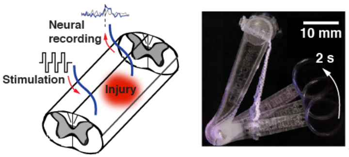 Fiber-based tools for spinal cord repair and artificial musclesIn addition to neural interrogation, we are interested in using fiber-based all-polymer devices as scaffolds for neural tissue engineering and as potential replacements to the injured organs. The versatility of the fiber drawing process allows us to investigate the surface polarity and topographic structure of polymer-based nerve guidance channels on the axonal growth. Furthermore, we can design the fiber-based scaffolds to incorporate neural recording and optical neuromodulation capabilities. The latter may enable us to investigate the role of neural excitation on the axonal growth within the topographically controlled environment. We have recently found that optical neural excitation increases axonal growth by 3-4 fold, and furthermore exerts a directional bias on the growth of unstimulated tissues (Sci. Rep. 2015). By combining this finding with the ability to optimize the scaffold geometry (Biomaterials 2016) and nutrient transport (Adv. Mater. 2019) we intend to control the formation of synaptic connections between the neurons trapped within our scaffolds and the neurons within the brain, spinal cord or peripheral nerves.